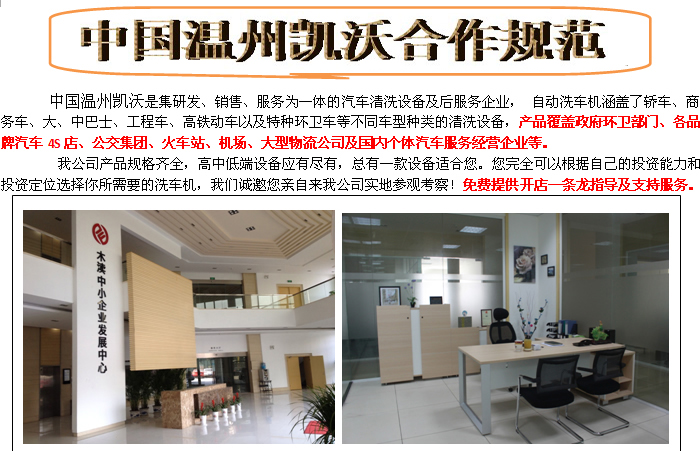 瑞安凱沃公司洗車(chē)設(shè)備從研發(fā)到生產(chǎn),直接到客戶(hù)手中,沒(méi)有中間商環(huán)節(jié),價(jià)格更加實(shí)惠,還會(huì)得到更好的保修服務(wù)。 我們首家推出:買(mǎi)洗車(chē)設(shè)備就可獲得從籌備到開(kāi)業(yè)的全方位支持。不僅省心省力,同等規(guī)模的經(jīng)營(yíng)項(xiàng)目更比加盟別人品牌節(jié)約投資30%以上,因?yàn)槲覀冊(cè)O(shè)備都是廠家直銷(xiāo)價(jià),還可以從我們這里得到經(jīng)營(yíng)、管理、培訓(xùn)、原料配給、技術(shù)支持等全方位的免費(fèi)增值服務(wù);更沒(méi)有所謂的加盟費(fèi)、保證金和品牌使用費(fèi)。市面上也有一些加盟企業(yè)對(duì)外宣稱(chēng)免收加盟金、保證金和品牌使用費(fèi),卻變相的把產(chǎn)品價(jià)格翻了幾倍,照樣賺翻加盟商的錢(qián),最后發(fā)覺(jué)上當(dāng)受騙還得不到什么實(shí)際的支持,任加盟商在大浪淘沙般的市場(chǎng)中自生自滅。