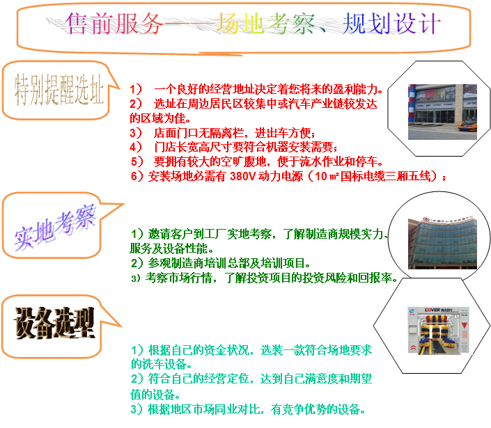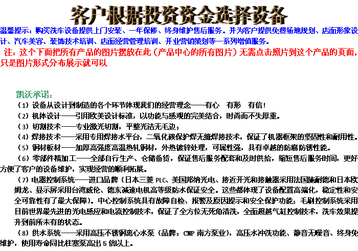 我公司產(chǎn)品規(guī)格齊全,高中低端設(shè)備應(yīng)有盡有,總有一-款設(shè)備適合您免費(fèi)費(fèi)提供開(kāi)店一 條龍指導(dǎo)及支持服務(wù)。投資定位選擇你所需需要的洗車(chē)機(jī)。我們誠(chéng)邀您親自來(lái)我公司實(shí)地參觀考察!